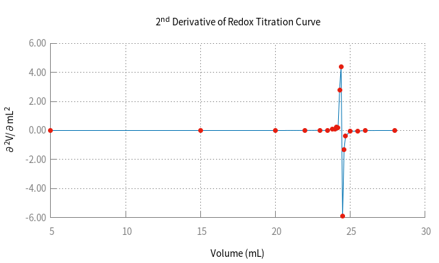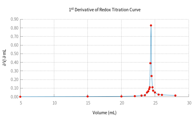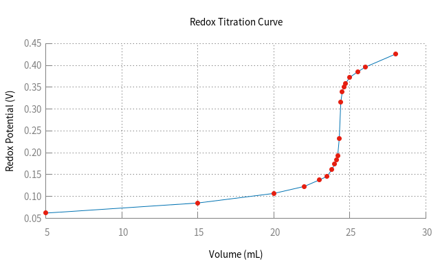 ------------------------ Volume Redox Potential (mL) (Volt) ------------------------ 5 0.062 15 0.085 20 0.107 22 0.123 23 0.138 23.5 0.146 23.8 0.161 24 0.174 24.1 0.183 24.2 0.194 24.3 0.233 24.4 0.316 24.5 0.34 24.6 0.351 24.7 0.358 25 0.373 25.5 0.385 26 0.396 28 0.426 ------------------------Plot of Titration Curve