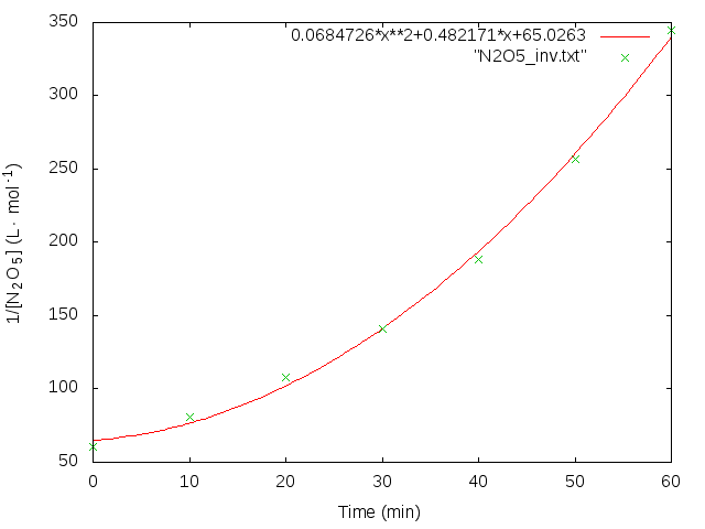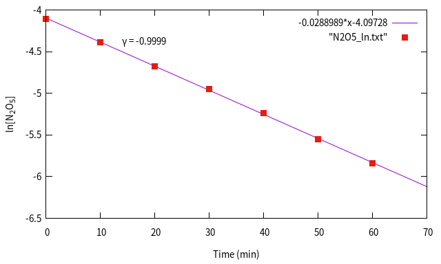 chmod +x N2O5_plotpng.gplt N2O5_plot.png will be generated in the current folder after you run ./N2O5_plotpng.gplt gnuplot> fit m*x+b 'N2O5_ln.txt' using 1:2 via m,bgnuplot> stats 'N2O5_ln.txt'gnuplot> stats 'N2O5_ln.txt' name "GAMMA" (save output to variable GAMMA for later use)Linear Model: y = -0.0289 x - 4.097 Slope: -0.0289 +- 0.0002205 Intercept: -4.097 +- 0.007951 Correlation: r = -0.9999 Sum xy: -1123should give consistent results with the