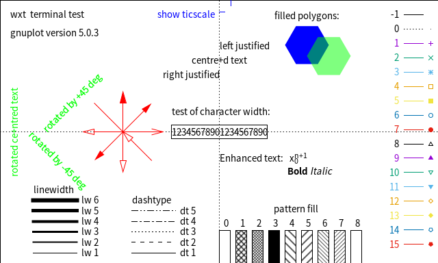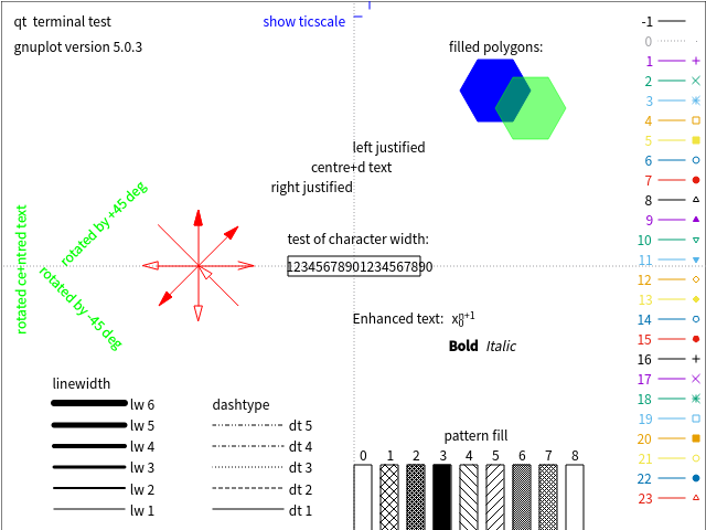 test to show figures of wxt style and qt style list.gnuplot> set term png enh; set output 'line_fit.png'; set label 1 sprintf("{/Symbol g} = %6.4f",GAMMA_correlation) at graph 0.2, graph 0.85; set xlabel "Time (min)"; set ylabel "ln[N_2O_5]"; plot [x=0:70] -0.0288989*x-4.09728, "N2O5_ln.txt" linecolor 7 linewidth 3 pointtype 20 pointsize 1